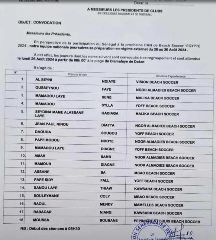La CAN Beach Soccer est prévue en Egypte, au mois d’octobre 2024 et le coach du Sénégal, Ngalla Sylla est en pleine préparation pour cette compétition. Ainsi, un regroupement des Lions va se tenir du 26 au 30 août 2024 à la plage de Diamalaye à Dakar. Le technicien a publié une liste de 18 joueurs qui vont prendre part à ce regroupement dont une absence de taille, celle de Mandione Laye Diagne, meilleur buteur de la dernière CAN en 2022.