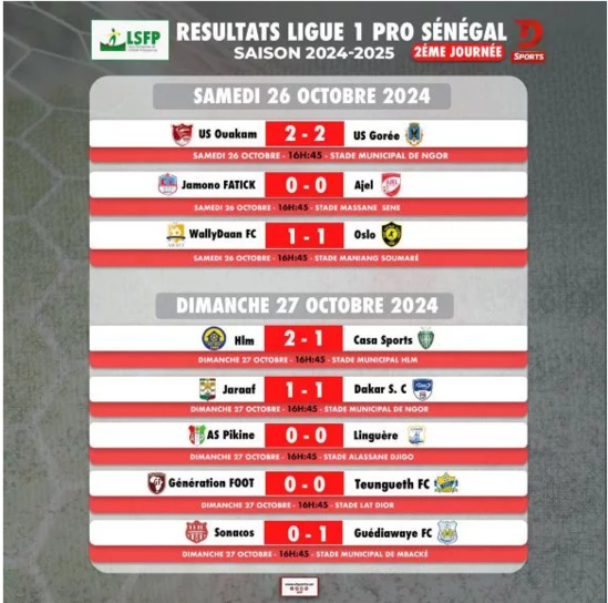 Enfin, le promu Wally Daan (14e, 1 pt-1) et la lanterne rouge AS Pikine (16e, 1 pt-3) ont été accrochés chez eux, respectivement, par le promu Oslo FA (15e, 1 pt-2) et la Linguère (10e, 2 pts), après des scores de 1-1 et 0-0.